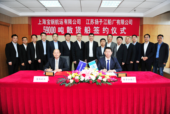 ▲11月13日下午,我集團(tuán)下屬江蘇揚子江船廠有限公司與上海寶鋼航運有限公司簽署了2艘59000噸散貨船新造船合同。集團(tuán)董事長任樂天先生,寶鋼資源(國際)有限公司董事長張典波先生,寶鋼資源(國際)有限公司總裁陸克從先生,我集團(tuán)副總經(jīng)理宋書明先生,副總經(jīng)理杜成忠先生,以及來自寶鋼資源、寶武原料、寶鋼航運、中聯(lián)海運、上海船舶研究設(shè)計院、中國船級社等領(lǐng)導(dǎo)和重要嘉賓出席簽約儀式。